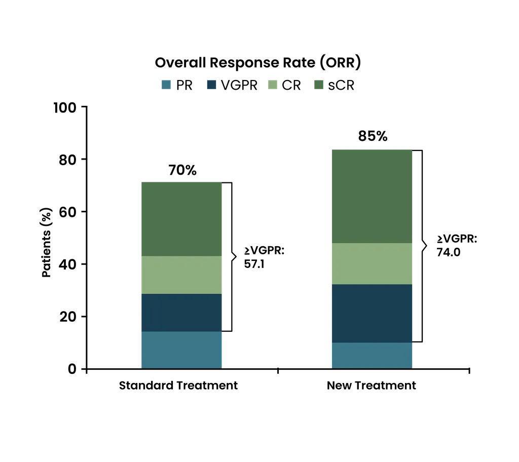 - Deep response rates (VGPR or better): Looking at the sections marked by the line on the side of each bar